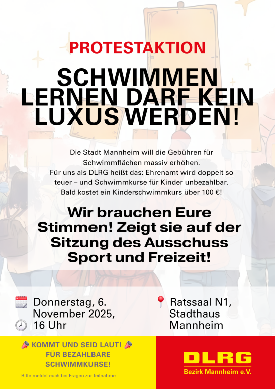 Liebe Mitglieder und Unterstützerinnen und Unterstützer der DLRG Mannheim, die Stadt Mannheim plant, die Gebühren für die Nutzung städtischer Schwimmflächen neu zu regeln. Nach aktuellem Stand soll die DLRG Mannheim von der bisherigen Kategorie A in die teurere Kategorie B der Gebührenordnung eingestuft werden. In Kategorie A ist die DLRG derzeit der einzige Verein, der sich auf die grundlegende Schwimmausbildung konzentriert. Die übrigen Vereine dieser Kategorie sind fast ausschließlich im Leistungs- und Wettkampfsport aktiv. Für uns als ehrenamtliche, gemeinnützige Organisation bedeutet die geplante Umstufung: Wir können die höheren Gebühren nicht selbst tragen. Die Mehrkosten müssten auf die Teilnehmenden unserer Schwimmkurse umgelegt werden – mit der Folge, dass Kinderschwim ... Mehr erfahren